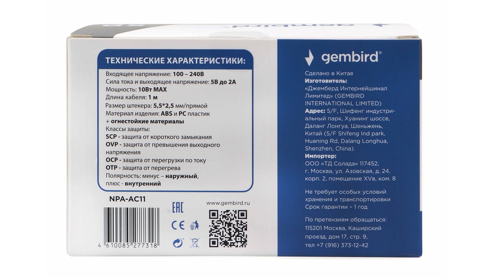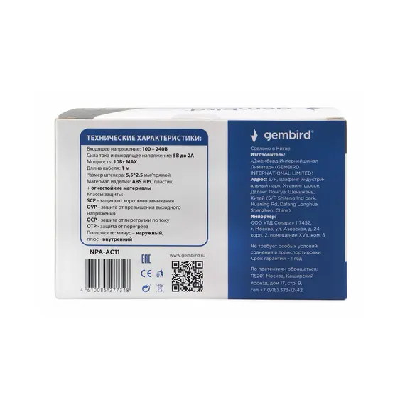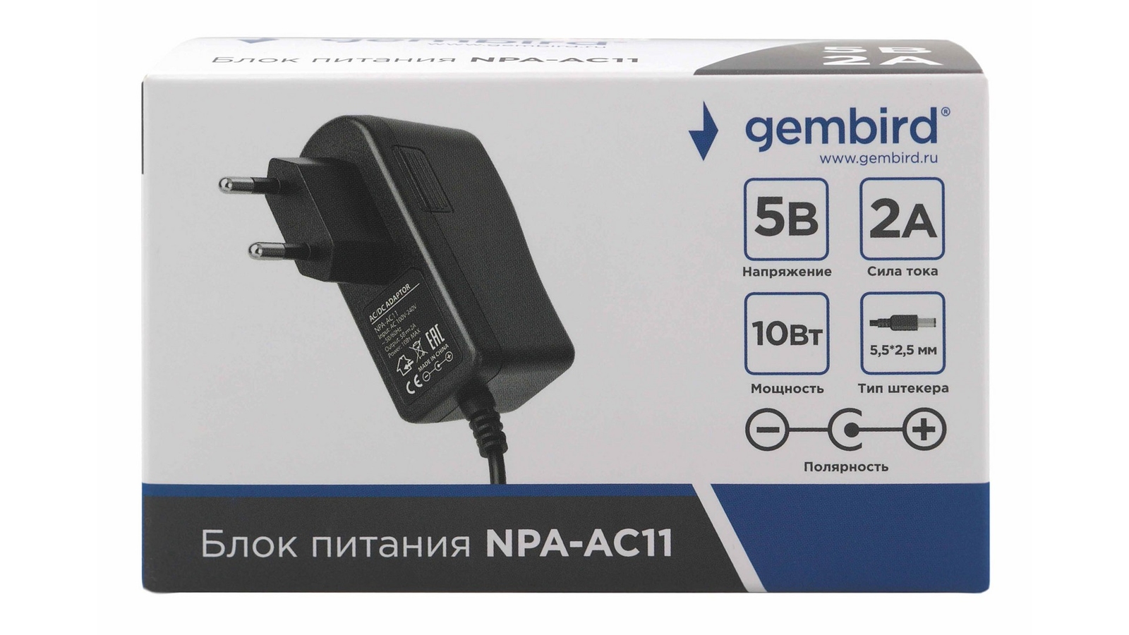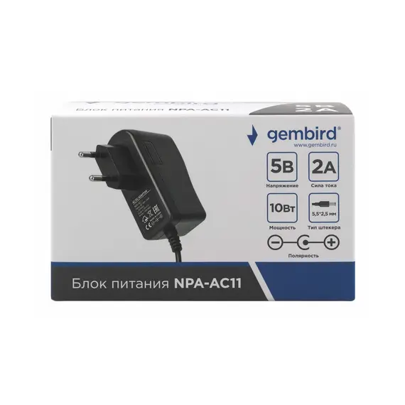 Адаптер питания GEMBIRD узкий 5В/2А, 10Вт, 1 штекер 5,5х2,5мм (NPA-AC11)
