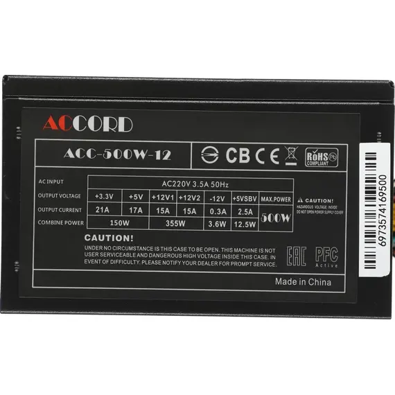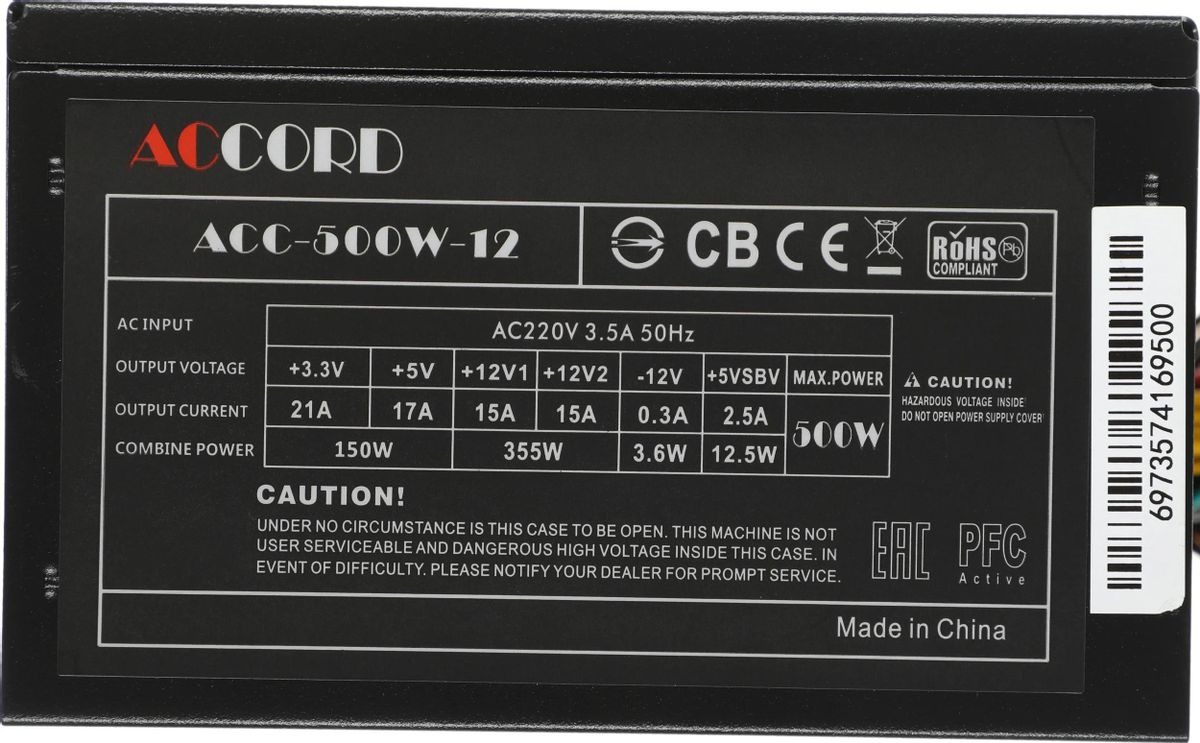 Блок питания ACCORD 500 Вт, ACC-500W-12, OEM ATX, активный PFC, 120 мм (ACC-500-12)