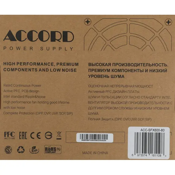 Блок питания ACCORD 600 Вт SFX, активный PFC, 80 мм (ACC-SFX600-80)