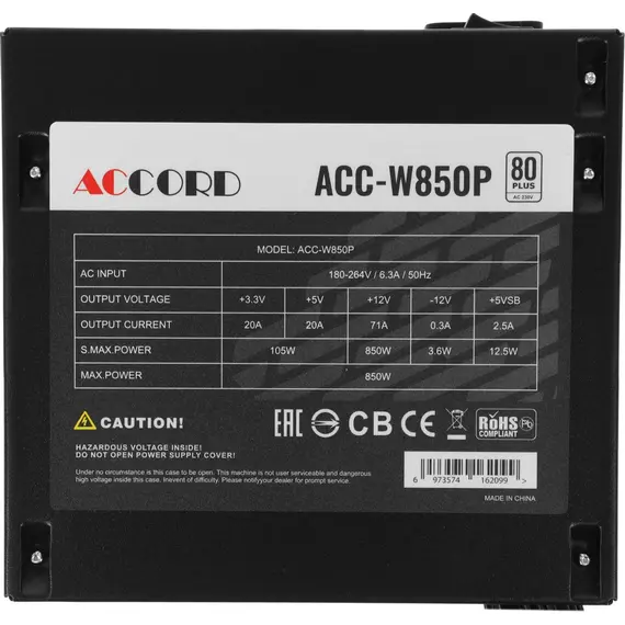 Блок питания ACCORD 850 Вт ATX, активный PFC, 120 мм, 80 PLUS Standard (ACC-W850P)