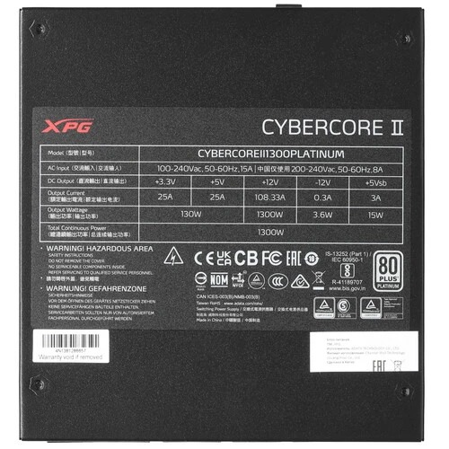 Блок питания XPG 1300 Вт, CYBERCORE II ATX, активный PFC, 120 мм, 80 PLUS Platinum, модульные кабели (CYBERCOREII1300P-BKCEU)