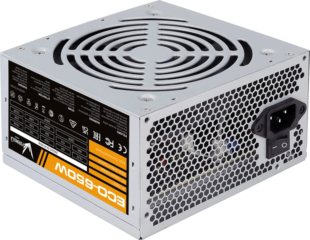ECO-650W Несмотря на то что блок питания ECO подходит для базовых сборок ПК, в него внедрили все технические особенности качественного блока питания: 12-см вентилятор с терморегулятором скорости, выходные защиты, а также чистый выходной постоянный ток с низкими шумами и пульсациями.
