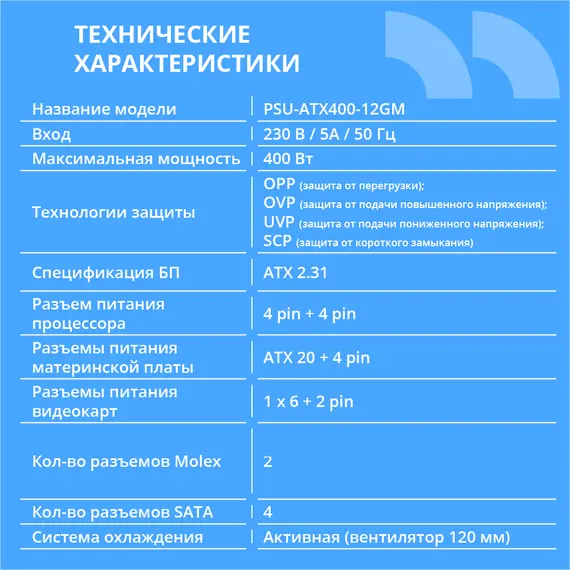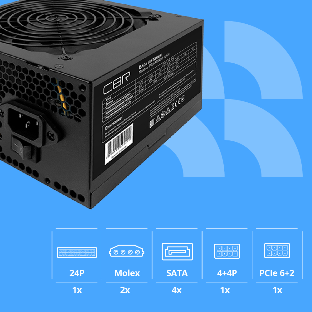 Блок питания CBR 400 Вт ATX, активный PFC, 120 мм, 80 PLUS Bronze (PSU-ATX400-12GM)