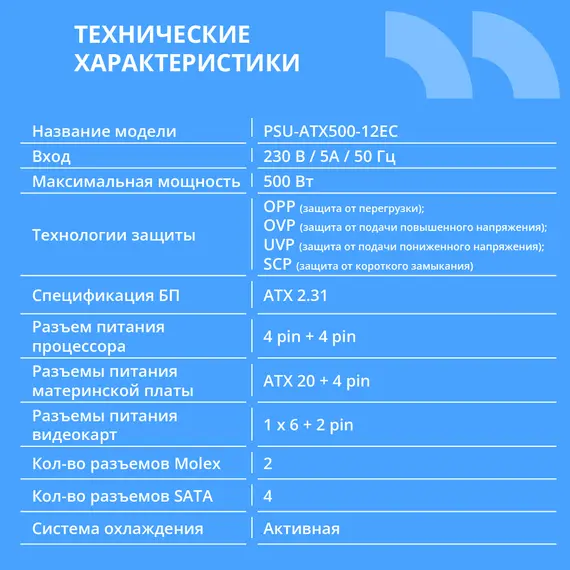 Блок питания CBR 500 Вт, OEM ATX, 120 мм (PSU-ATX500-12EC)