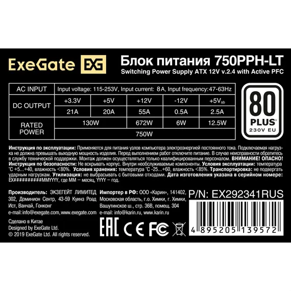 Блок питания EXEGATE 750 Вт, 750PPH-LT-S ATX, активный PFC, 120 мм, 80 PLUS Standard (EX292341RUS-S)