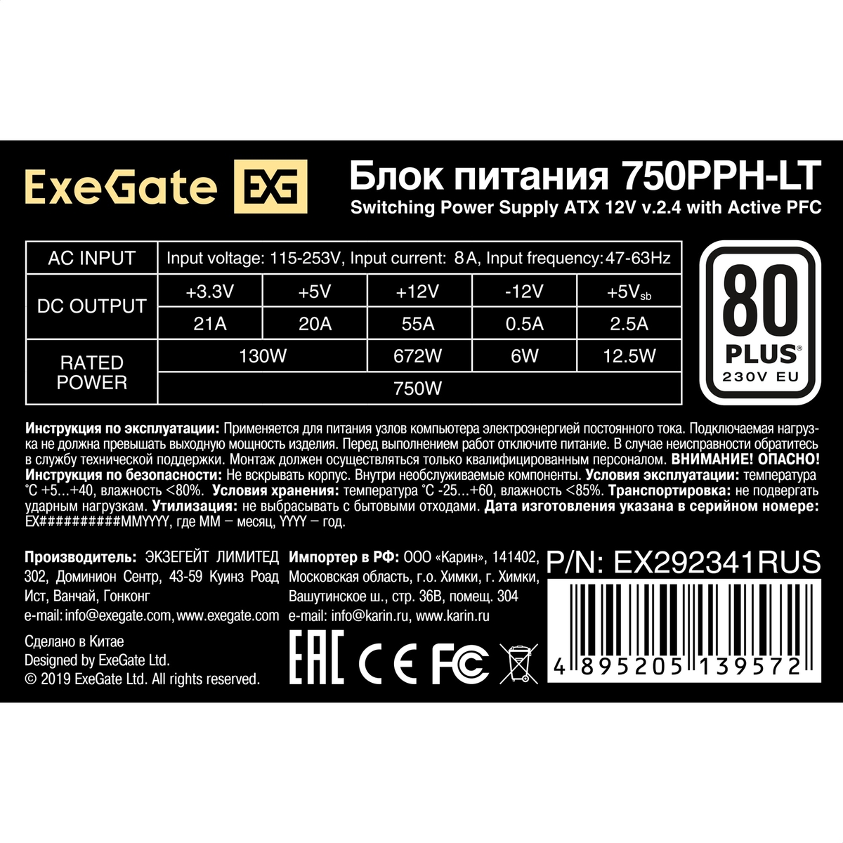 Блок питания 750W ExeGate 80 PLUS® 750PPH-LT-S-OEM