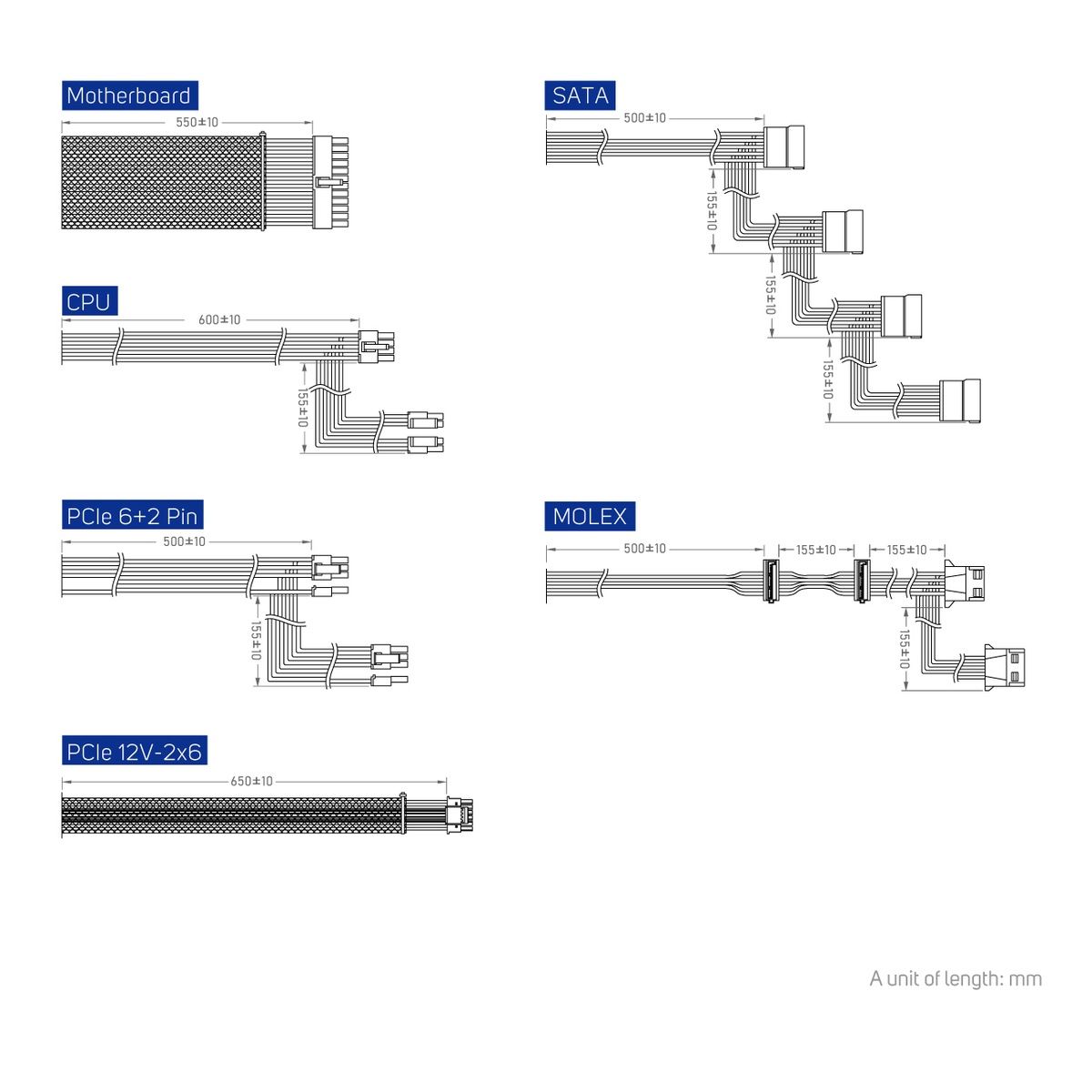 Универсальность подключения: 4 разъёма 6 + 2pin PCI-E и 1 разъём 16(12 + 4)pin PCI-E/12VHPWR для подключения видеокарт и других устройств.