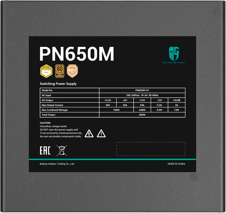 Блок питания GAMERSTORM 650 Вт ATX, активный PFC, 120 мм, 80 PLUS Gold, Cybenetics Gold, модульные кабели (GS PN650M)