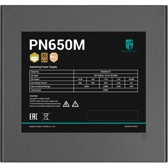 Блок питания GamerStorm PN650M черного цвета обладает мощностью 650 Вт и предназначен для комплектации производительных ПК. Сертификат 80+ Gold говорит о высоком КПД при использовании в игровых системах, надежности питания, устойчивости к помехам.