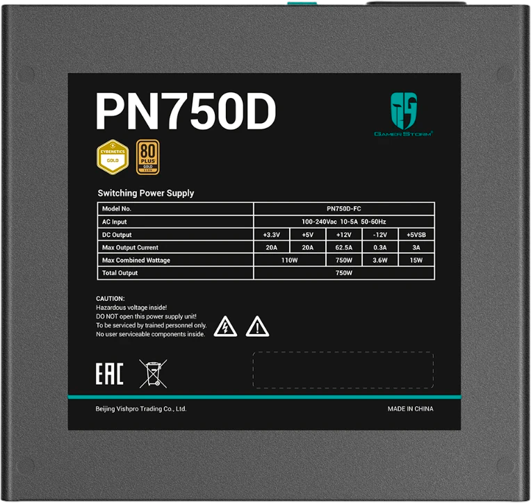 Блок питания GAMERSTORM 750 Вт ATX, активный PFC, 120 мм, 80 PLUS Gold, Cybenetics Gold (GS PN750D)
