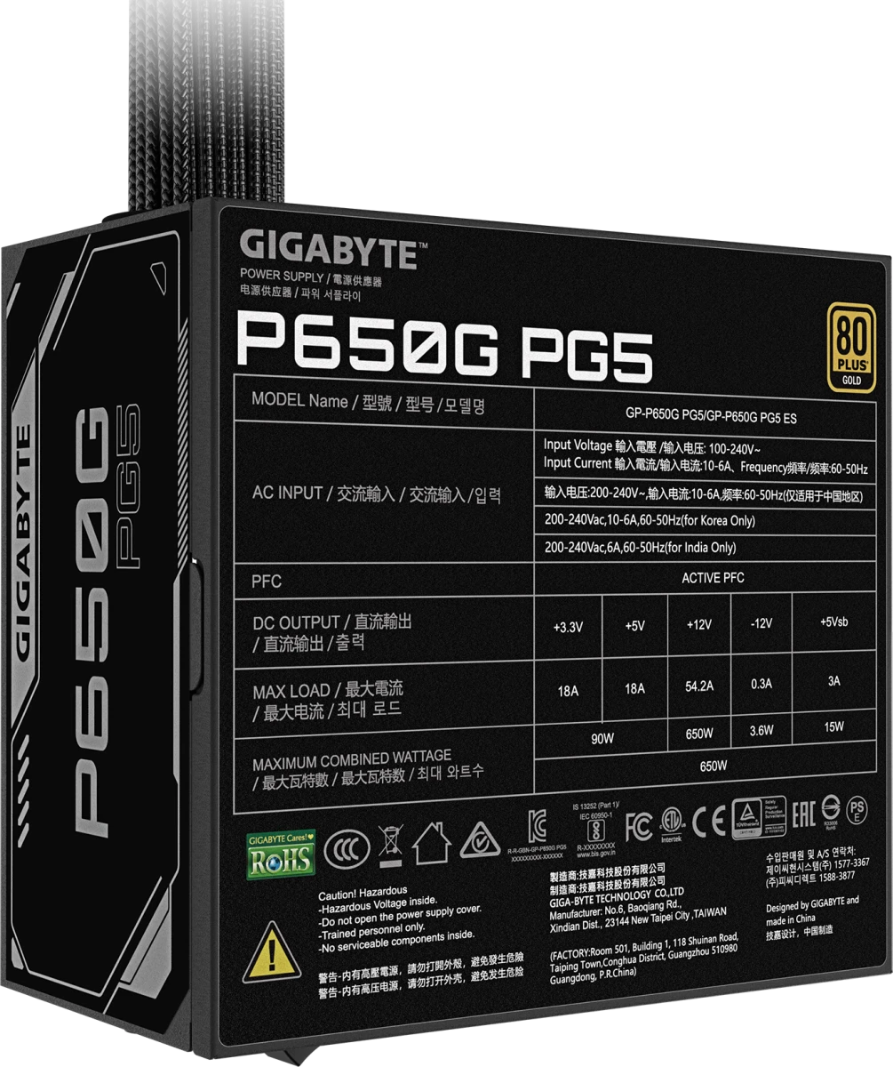 Блок питания GIGABYTE 650 Вт, P650G PG5 ATX, активный PFC, 120 мм, 80 PLUS Gold (GP-P650G PG5)
