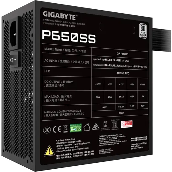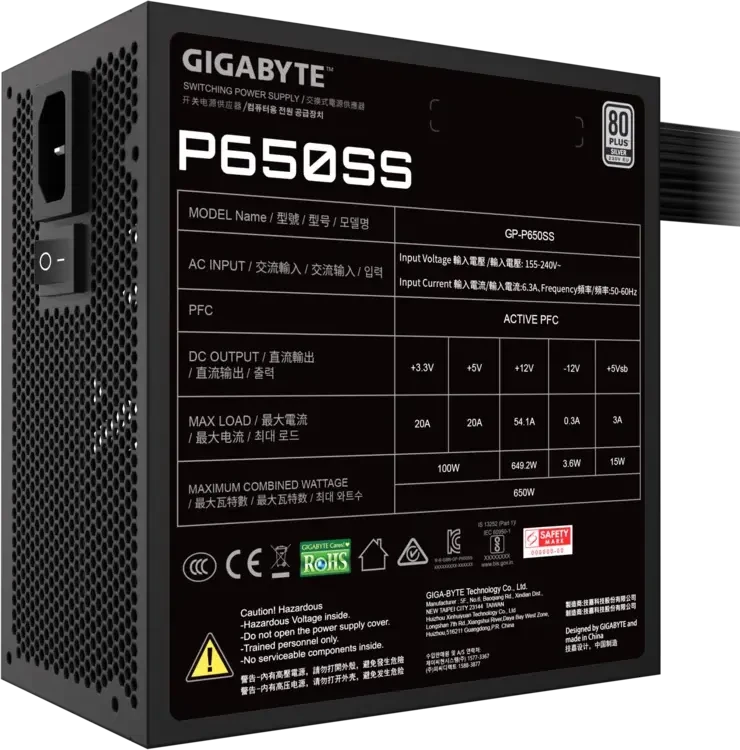 Блок питания GIGABYTE 650 Вт, P650SS ATX, активный PFC, 120 мм, 80 PLUS Silver (GP-P650SS)