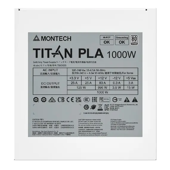 Блок питания MONTECH 1000 Вт, TITAN PLA 1000W ATX, активный PFC, 135 мм, 80 PLUS Platinum, модульные кабели (TIX0125)