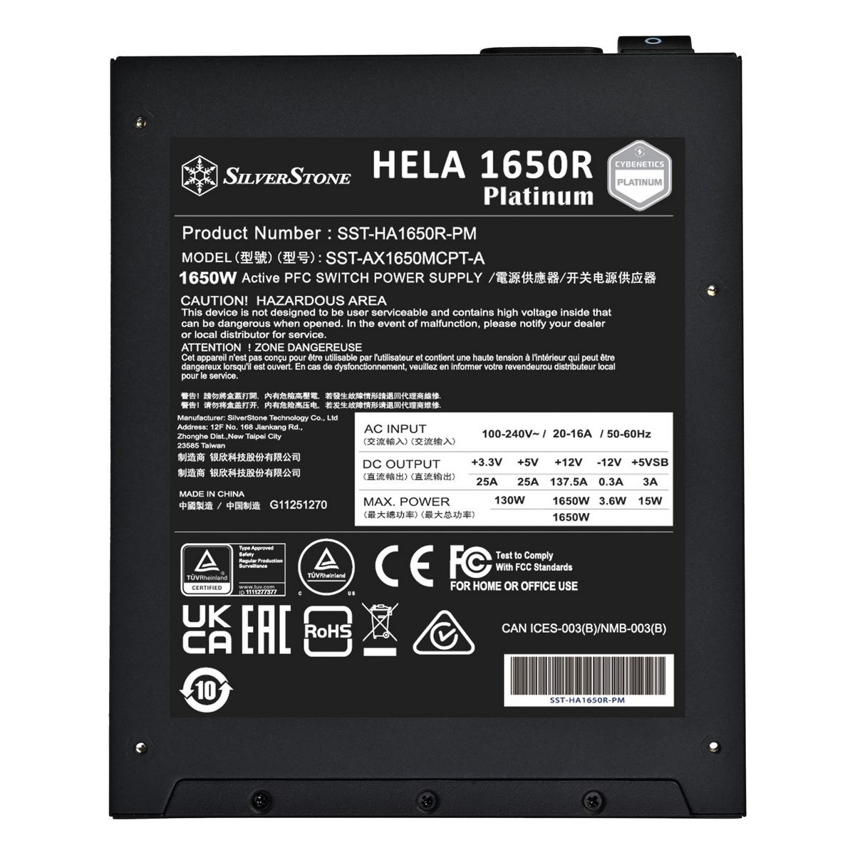 Блок питания SILVERSTONE 1650 Вт, SST-HA1650R-PM ATX, активный PFC, 140 мм, Cybenetics Platinum, модульные кабели (G540HA165R0M220)