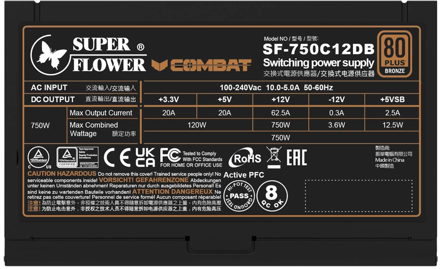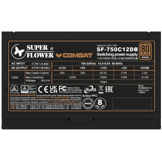 Блок питания SUPER FLOWER 750 Вт, Combat DB ATX, активный PFC, 120 мм, 80 PLUS Bronze (SF-750C12DB)