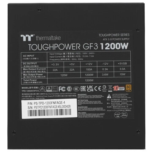 Блок питания THERMALTAKE 1200 Вт, Toughpower GF3 1200 TPD-1200AH3FCG ATX, активный PFC, 135 мм, 80 PLUS Gold, модульные кабели (PS-TPD-1200FNFAGE-4)