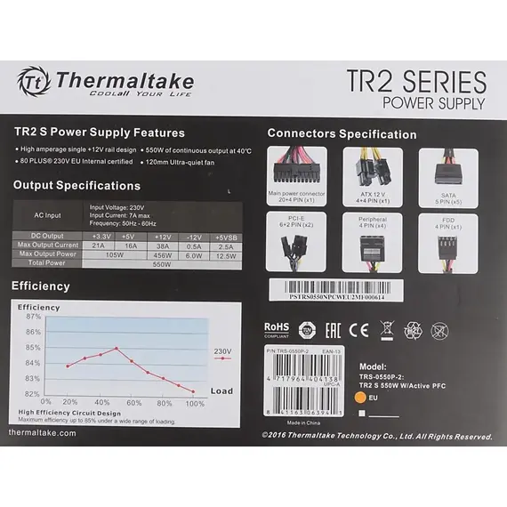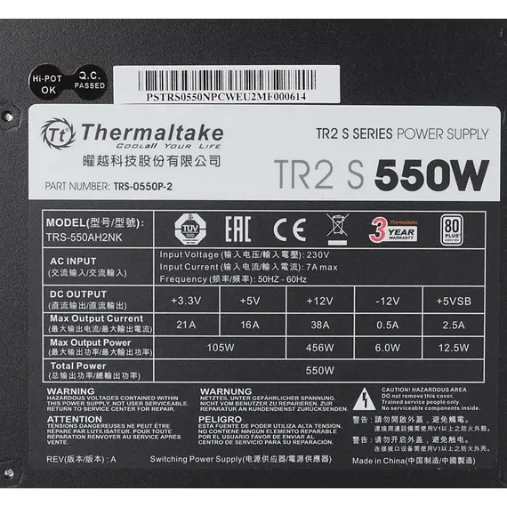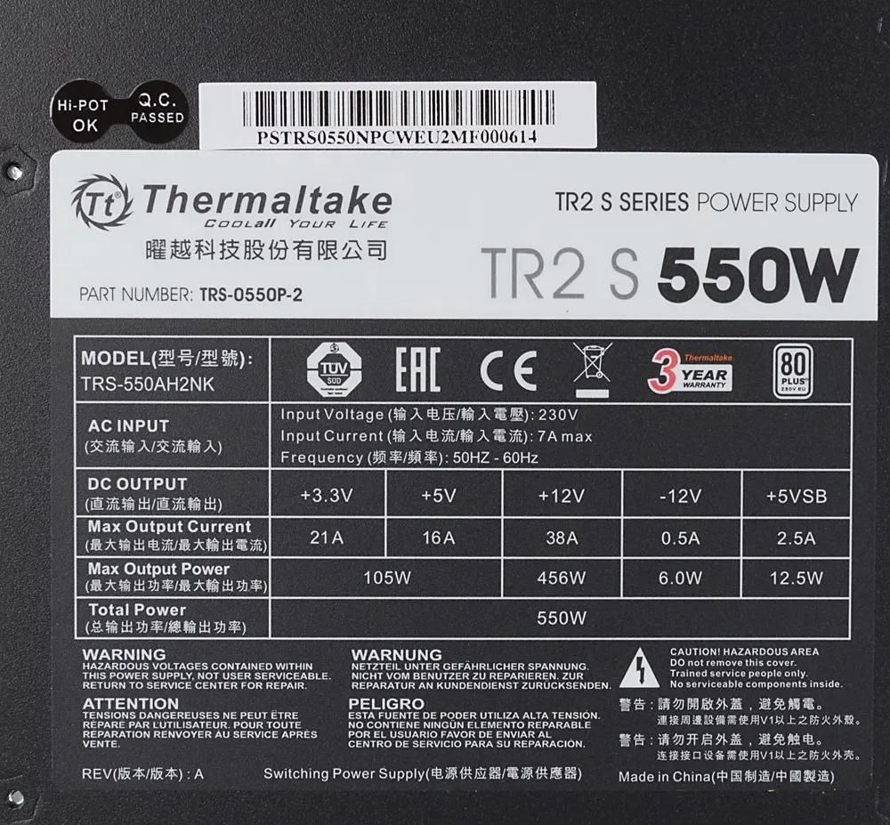 Блок питания THERMALTAKE 550 Вт, TR2 S ATX, активный PFC, 120 мм, 80 PLUS Standard (PS-TRS-0550NPCWEU-2)