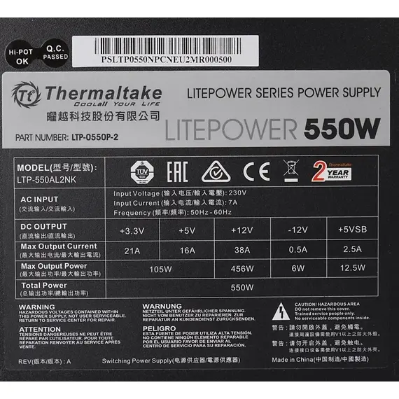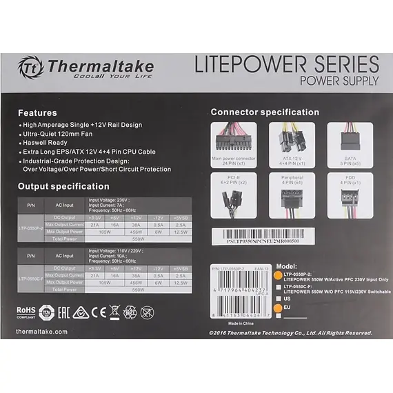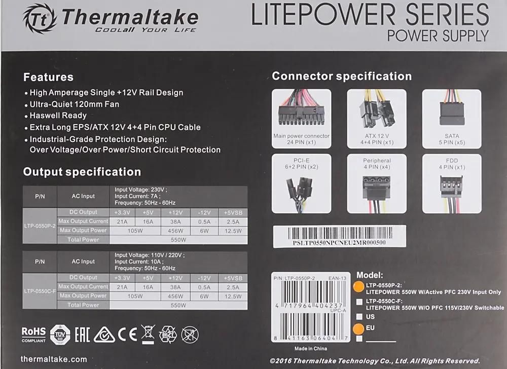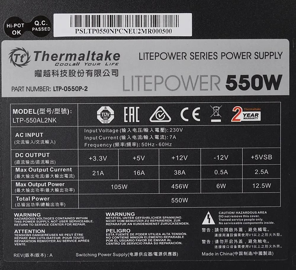 Блок питания THERMALTAKE 550 Вт, Litepower ATX, активный PFC, 120 мм (PS-LTP-0550NPCNEU-2)