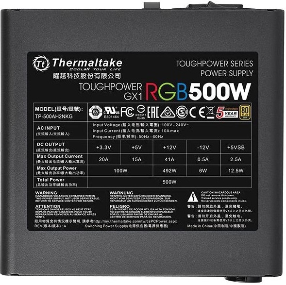 Блок питания THERMALTAKE 600 Вт, ToughPower GX1 RGB ATX, активный PFC, 120 мм, 80 PLUS Gold, подсветка (PS-TPD-0600NHFAGE-1)