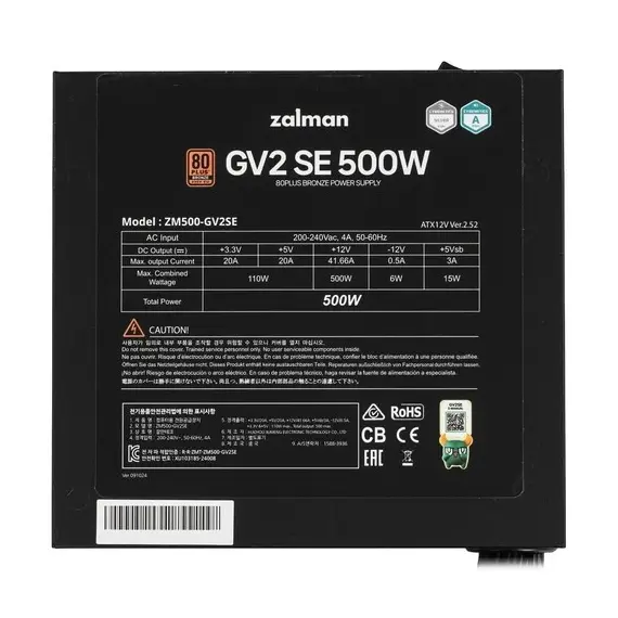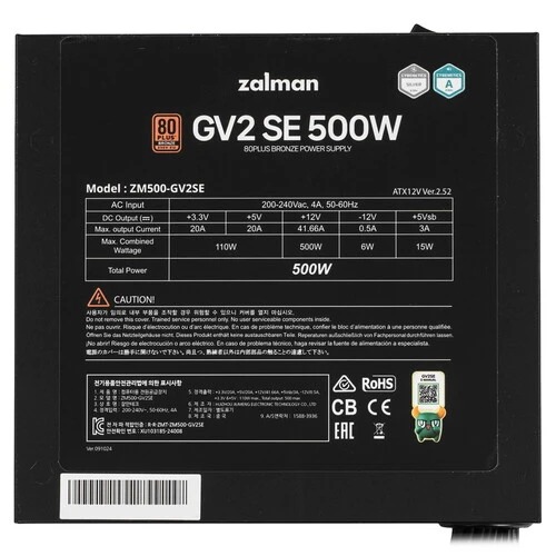 Блок питания ZALMAN 500 Вт, GV2SE ATX, активный PFC, 120 мм, 80 PLUS Bronze (ZM500-GV2SE)