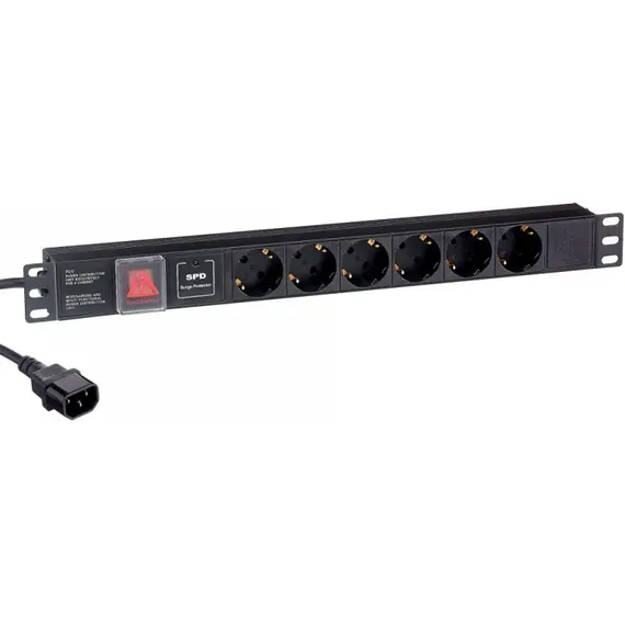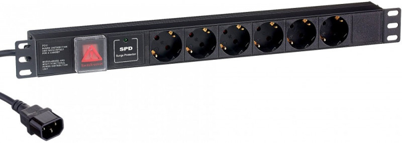 горизонтальный блок розеток, входной разъём: IEC 320 C14, розетки: 6x Schuko, макс. ток нагрузки 10A, фильтр защиты, выключатель с подсветкой, стандарт VDE, EAC, кабель 2м