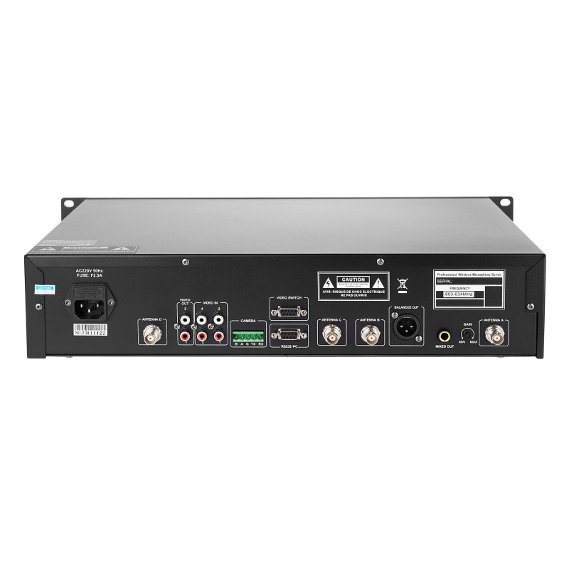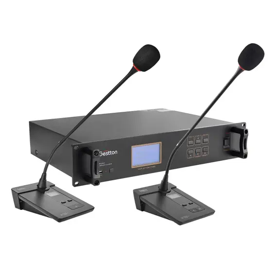 Беспроводная конгресс-система, которая поддерживает 250 микрофонных пультов. Одновременная работа 3-х микрофонных пультов (1 председатель + 2 делегата; 2 председателя + 1 делегат). Автоматическое наведение камеры на активный микрофонный пульт по протоколам PELCO P / D и YAAN. Запись мероприятий на USB-накопитель. Рабочее расстояние до 60 м. Информационный LCD-экран.