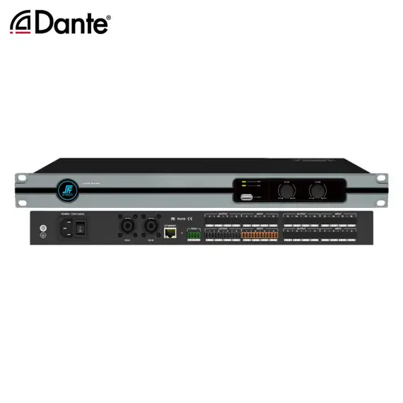 Цифровой аудиопроцессор с 4 аналоговыми входами и 4 выходами, 32-битным DSP (48 кГц) и встроенными алгоритмами AFC, AEC, ANS. Поддержка матричного микширования, 100 сцен, веб-управление и интерфейсы RS232/RS485, Ethernet.