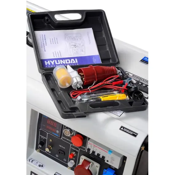 Особенности Двигатель HYUNDAI серии IC (industrial commercial). Электрозапуск 12 volt. Выключатель защиты при перегрузках. Аварийная остановка при низком уровне масла в картере. Увеличенный стальной топливный бак. Автоматический регулятор напряжения с защитой от КЗ. Транспортировочные колеса в комплекте.