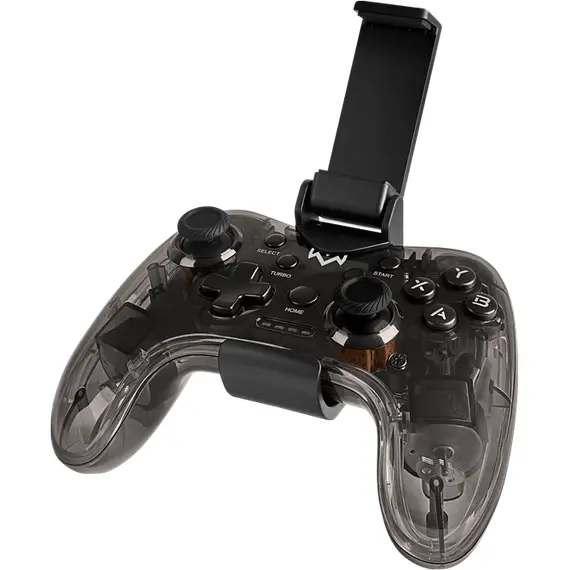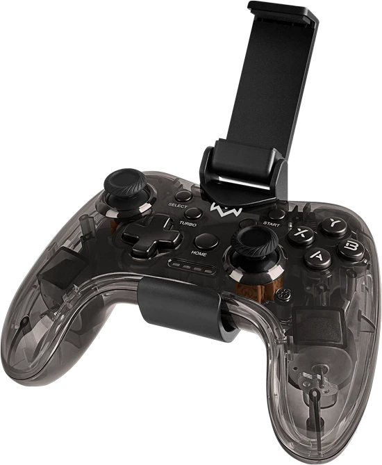 - Крепление для смартфона в комплекте: Специальный съемный держатель позволяет легко превратить ваш смартфон в портативную игровую консоль, надежно закрепив его над геймпадом.
