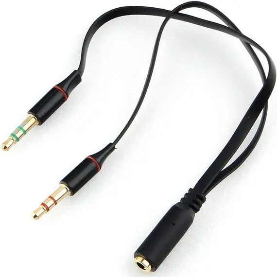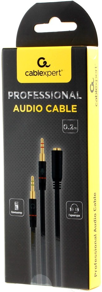 Аудиокабель-переходник Cablexpert CCAB-02-35F2M-0.2MB. 3.5 джек 4pin(F)/2х 3.5 джек(M) наушники и микрофон, 0.2м, черный, коробка