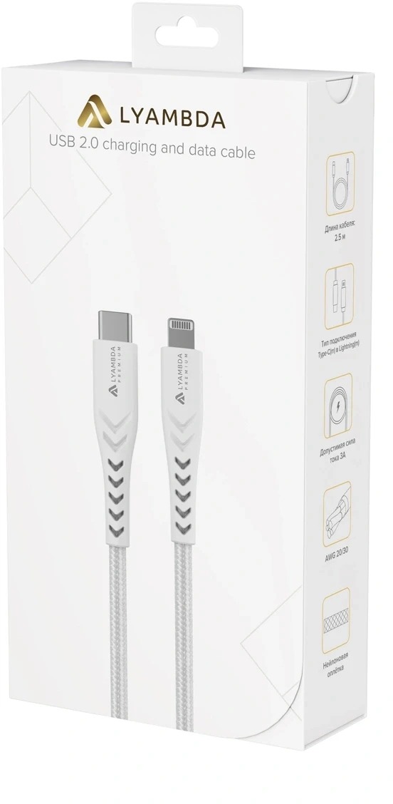 Кабель LYAMBDA USB, MFI, Type-C(m)/Lightning(m), 3A, 2,5м, белый (LCLm25-WH)