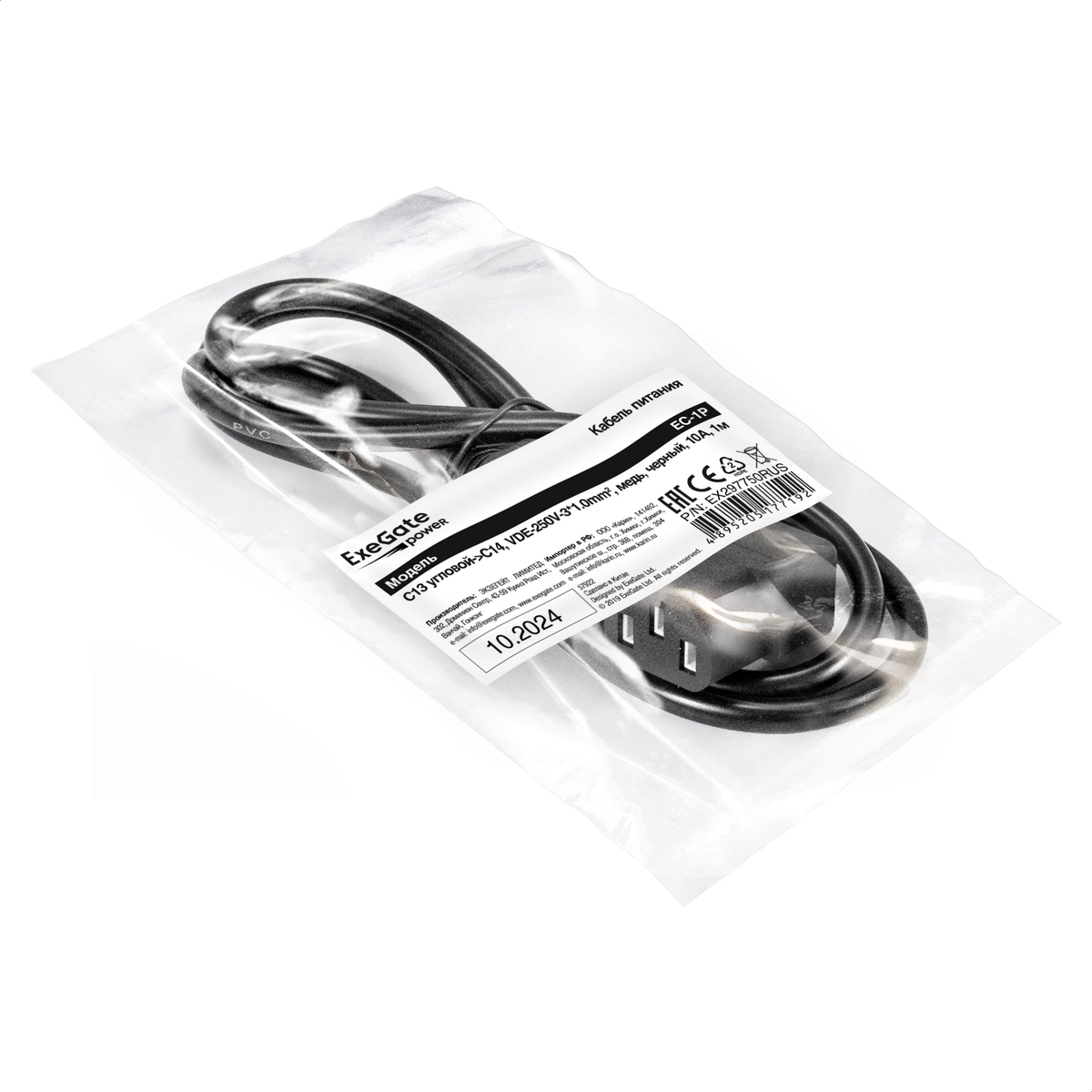 Кабель питания EXEGATE Power EC-1P (C13 угловой-C14, VDE-250V-3*1.0mm2, медь, черный, 16A, 1м) (EX297750RUS)