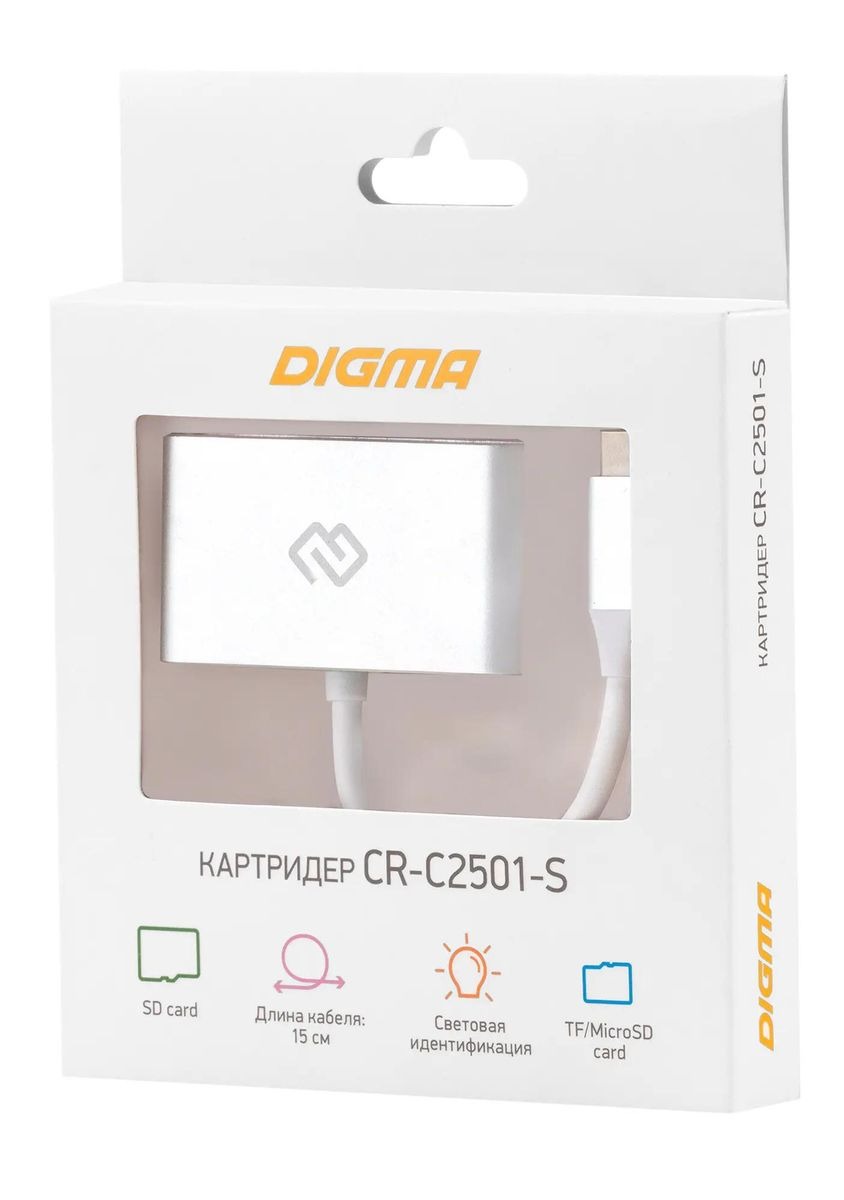 Картридер внешний DIGMA USB Type-C, для SD/TF/microSD, серебристый (CR-С2501-S)