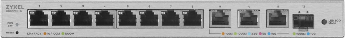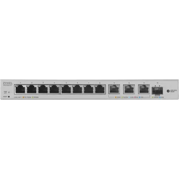Коммутатор ZYXEL XGS1250-12 мультигигабитный Smart L2, 8xGE, 3x1/2,5/5/10G, 1xSFP+, кнопка LED ECO Mode, настольный (XGS1250-12-ZZ0102F)