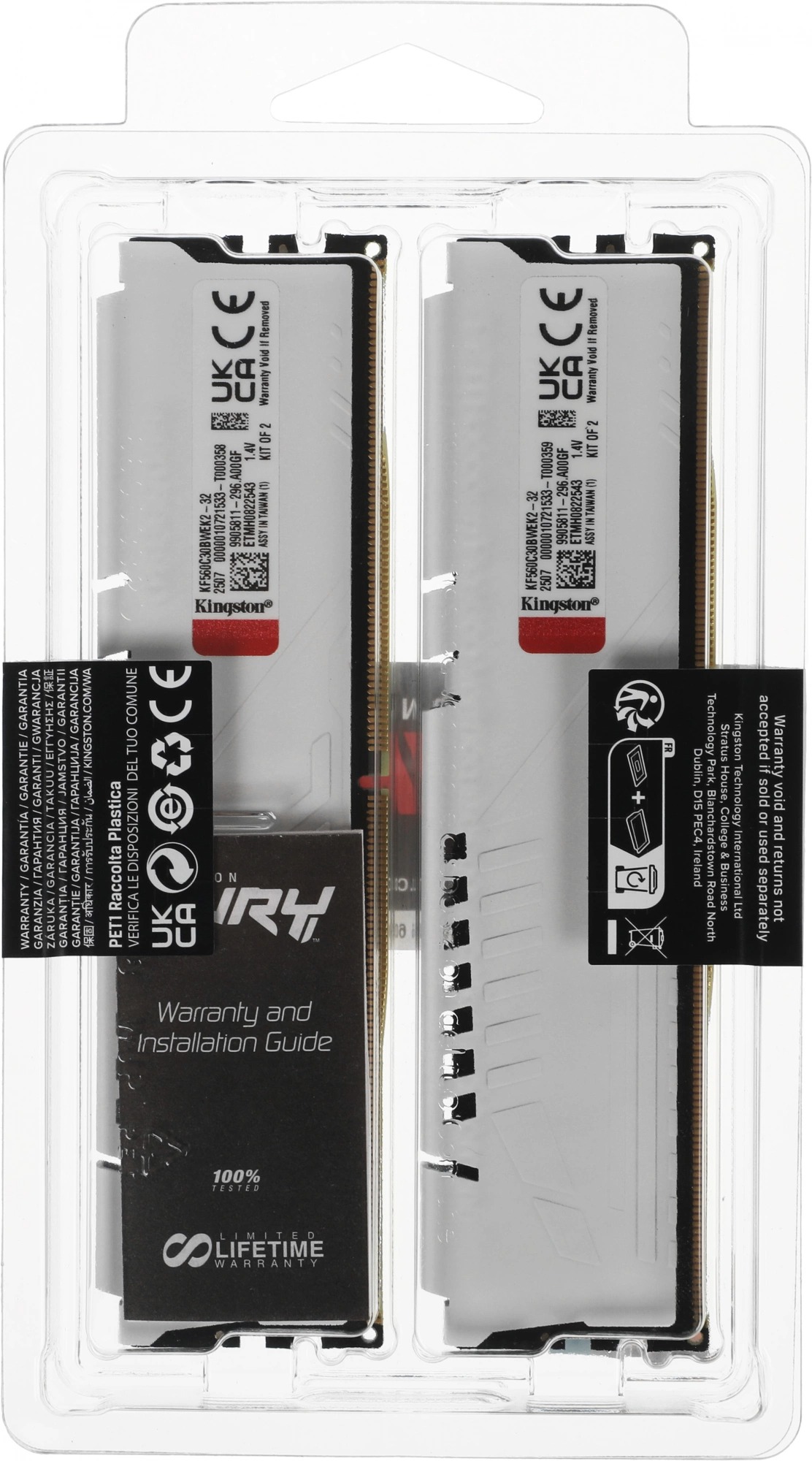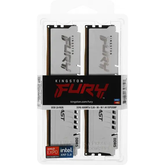 Комплект памяти KINGSTON 32 Гб, DDR5 DIMM, 6000 МГц, FURY Beast White 2 модуля, 48000 Мб/с, CL30, 1.4 В, EXPO, XMP, радиатор, 2x16Gb KIT (KF560C30BWEK2-32)