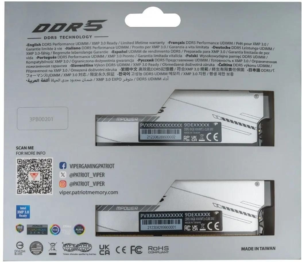 Комплект памяти PATRIOT MEMORY 32 Гб, DDR5 DIMM, Viper Xtreme 5 RGB Mpower, 6400 МГц 2 модуля, 51200 Мб/с, CL32, 1.4 В, XMP, радиатор, подсветка, 2x16Gb KIT (PVXR532G64C32KM)