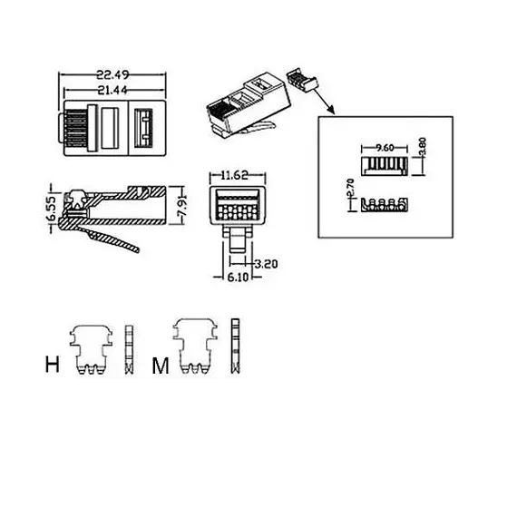 Hyperline PLUG-8P8C-UV-C6-100 Разъем RJ-45(8P8C) под витую пару, категория 6 (50 µ"/ 50 микродюймов), универсальный (для одножильного и многожильного кабеля), со вставкой (100 шт)