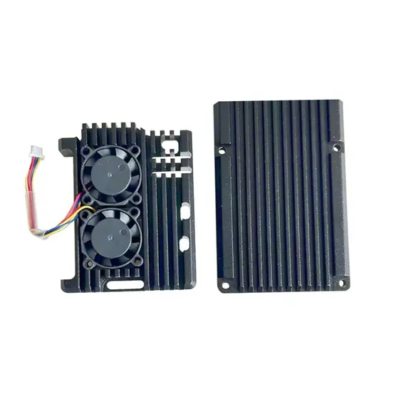 Корпус для одноплатного микрокомпьютера Raspberry Pi 5, состоящий из двух частей-радиаторов, верхней (с двумя предустановленными PWM вентиляторами) и нижней.