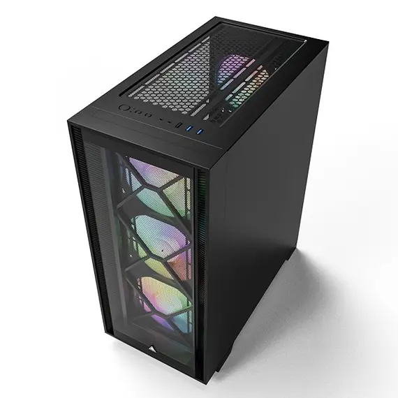 Дизайн: Корпус оснащен двумя передними панелями: сетчатой для улучшенного воздушного потока и панелью из закаленного стекла для стильного внешнего вида. Боковая панель из закаленного стекла на шарнирах обеспечивает удобный доступ к внутренним компонентам.