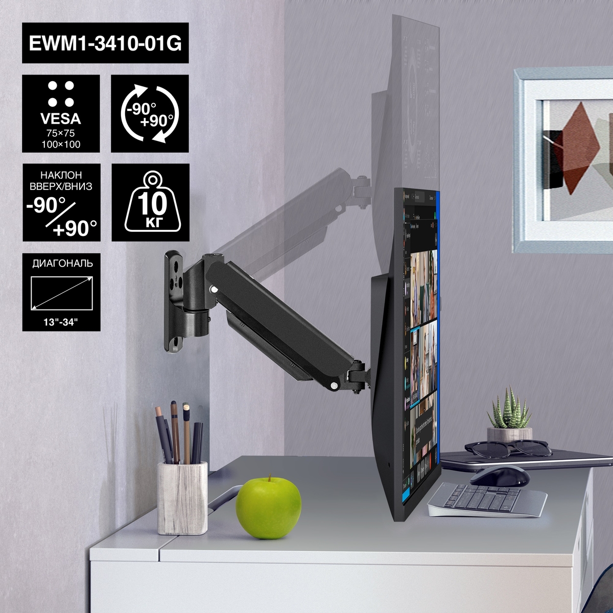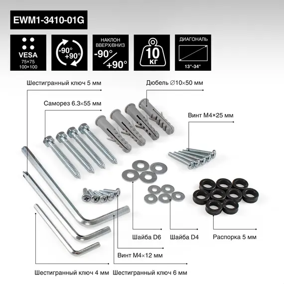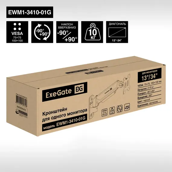 Кронштейн для монитора EXEGATE настенное EWM1-3410-01G (кронштейн для одного монитора 13"-34", газовая пружина, VESA 75x75, 100x100, нагрузка 2-10 кг, наклон -90°/+90°, вращение 360°, цвет черный) (EX297369RUS)