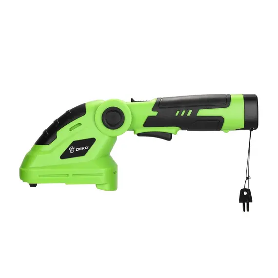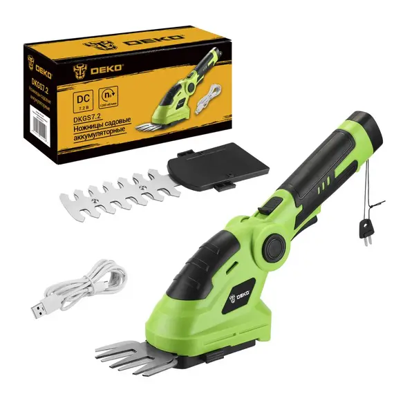 Ножницы садовые аккумуляторные DEKO DKGS7.2 - многофункциональный инструмент с 2 насадками, используемый для финишной обработки газона и ухода за кустами. Для контроля уровня заряда предусмотрен светодиодный индикатор. Замена насадок производится без применения дополнительного инструмента.