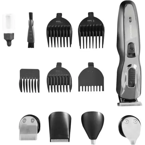 Особенности В комплекте: база для хранения, 5 сменных головок (для стрижки волос, триммер для бороды, бритва, триммер для точных линий и триммер для носа и ушей), 4 гребня (3/6/9/12мм), адаптер, масло для смазки и щеточка для чистки. ВАЖНО! Своевременная чистка и регулярная смазка продлевают срок службы.