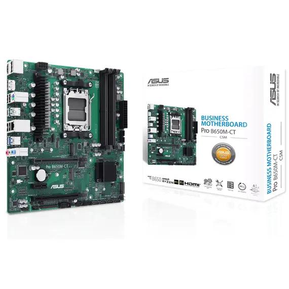 Материнская плата ASUS PRO B650M-CT-CSM — это высокофункциональное mATX-решение, разработанное для корпоративного сектора, профессиональных рабочих станций и встраиваемых систем, где критически важны надежность, управляемость и безопасность. Она идеально подходит для использования с новейшими процессорами AMD Ryzen 7000 и 8000 серий с сокетом AM5, предлагая поддержку памяти DDR5, а также расширенные корпоративные функции.
