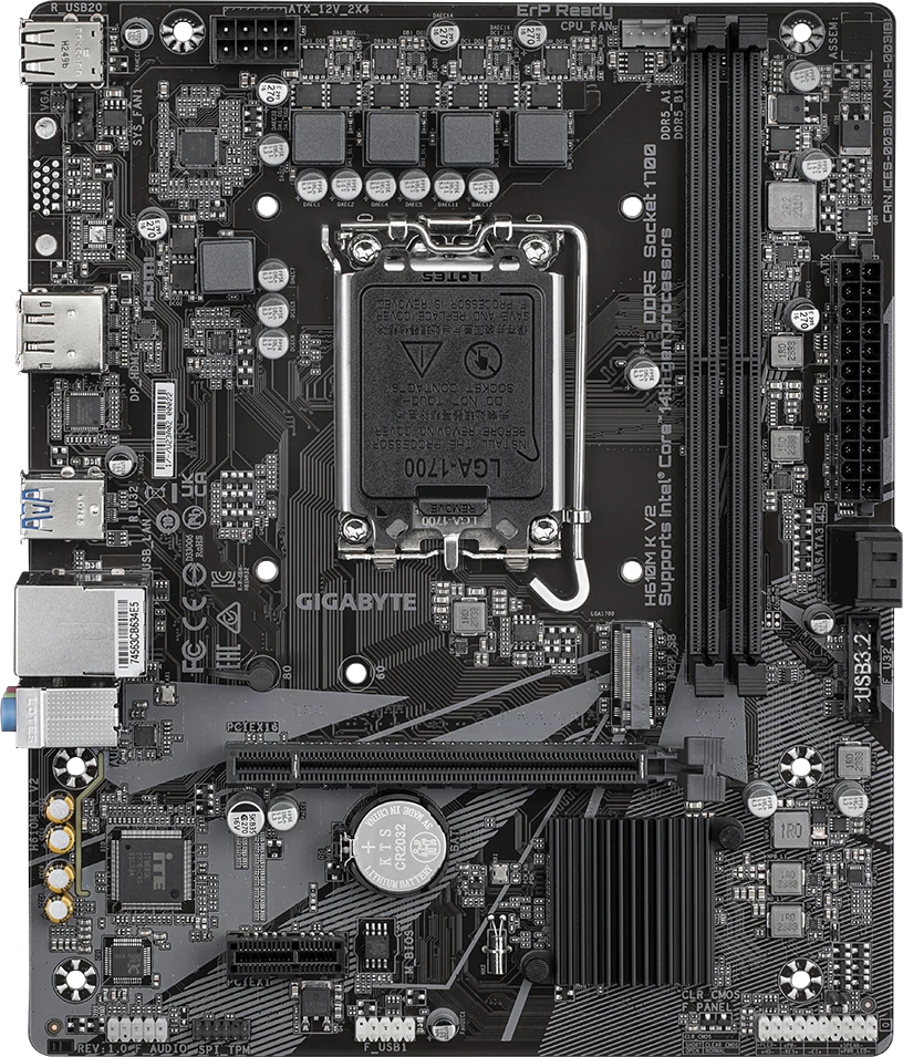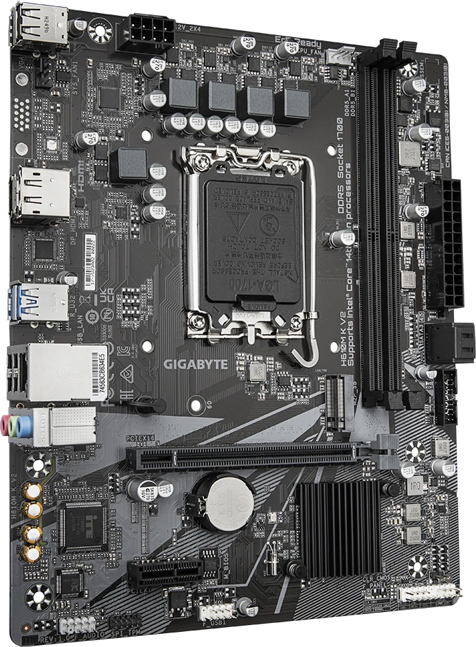 Gigabyte H610M K V2 — это компактная материнская плата формата Micro-ATX для процессоров Intel 12-го и новее поколений (Socket LGA 1700). Поддерживает современную память DDR5, оснащена слотом PCI-E 4.0 для видеокарты, разъёмом M.2 и видеовыходами HDMI/DisplayPort. Бюджетное решение для базовых офисных, мультимедийных или игровых систем начального уровня.