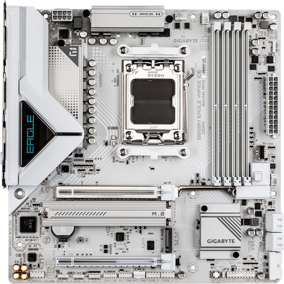 Материнская плата GIGABYTE Socket AM5, AMD B850, 4xDDR5, PCI-E 5.0, 2xM.2, HDMI, 2xDisplayPort, mATX, B850M EAGLE WF6E ICE (B850M EAGLE WIFI6E ICE)