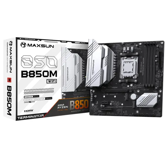 Материнская плата MAXSUN MS-Terminator B850M WIFI Socket AM5, AMD B850, 4xDDR5, PCI-E 5.0, 2xM.2, HDMI, DisplayPort, Wi-Fi+Bluetooth, mATX (6940709661741)