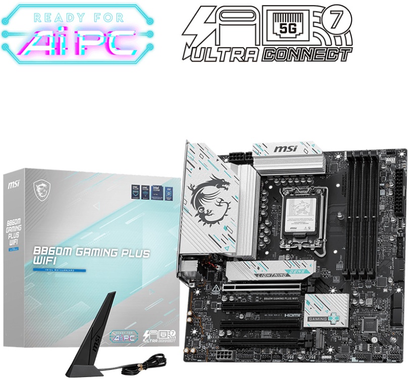 Материнская плата MSI B860M GAMING PLUS WIFI в форм-факторе Micro-ATX разработана для поддержки новейших процессоров Intel Core Ultra (серии 2) с разъёмом LGA 1851.