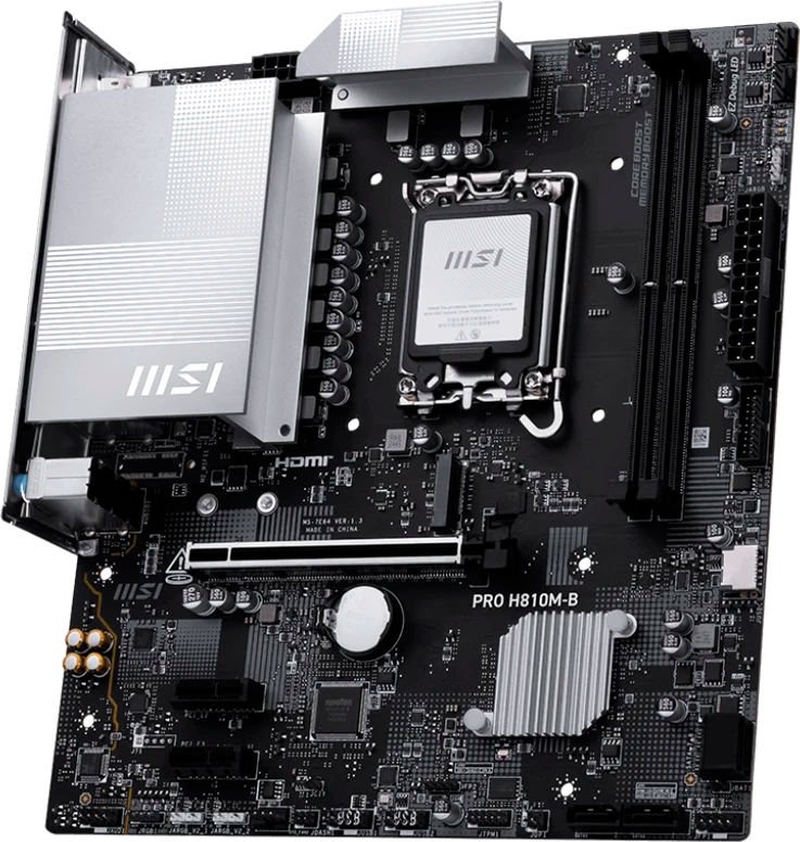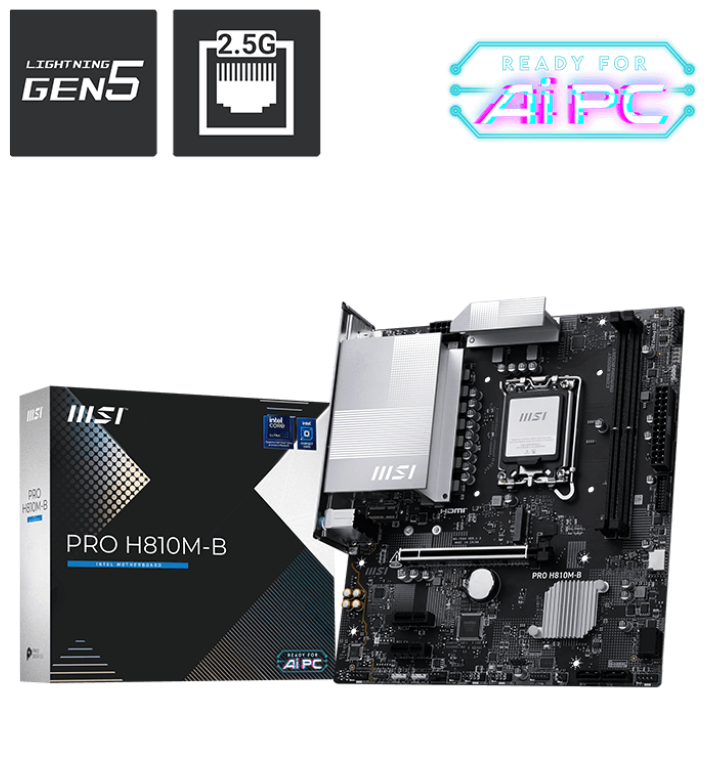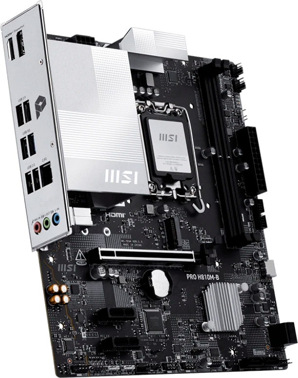 Модель PRO H810M-B отличается лаконичным дизайном с гармоничной серебристой цветовой гаммой, которая идеально сочетается как с белыми, так и с черными сборками ПК. Плата оснащена интерфейсами 2.5G LAN и PCIe 5.0 и разработана для работы с процессорами Intel® Core™ Ultra.