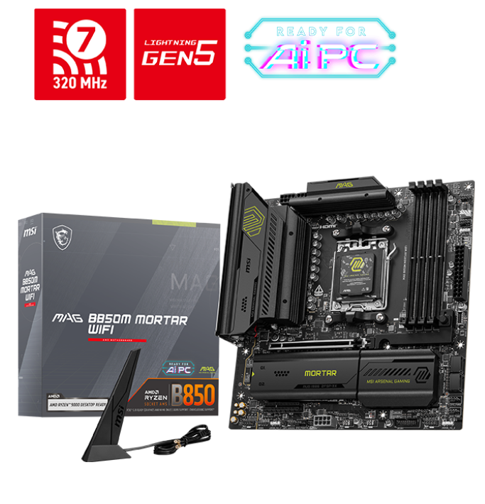 Материнская плата MSI Socket AM5, AMD B850, 4xDDR5, PCI-E 5.0, 3xM.2, HDMI, Wi-Fi+Bluetooth, mATX (MAG B850M MORTAR WIFI)