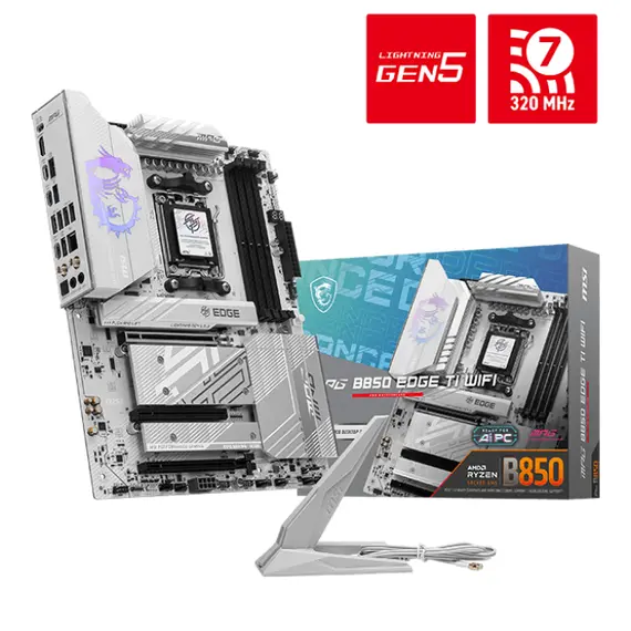 Материнская плата MSI MPG B850 EDGE TI WIFI – это премиальное и стильное решение формата ATX для сборки высокопроизводительных игровых систем и рабочих станций. Она сочетает в себе элегантный серебристо-белый дизайн (EDGE TI), передовые технологии и мощную подсистему питания, что делает ее идеальным выбором для энтузиастов и геймеров, которые ищут отличное соотношение цены и возможностей чипсета B850.